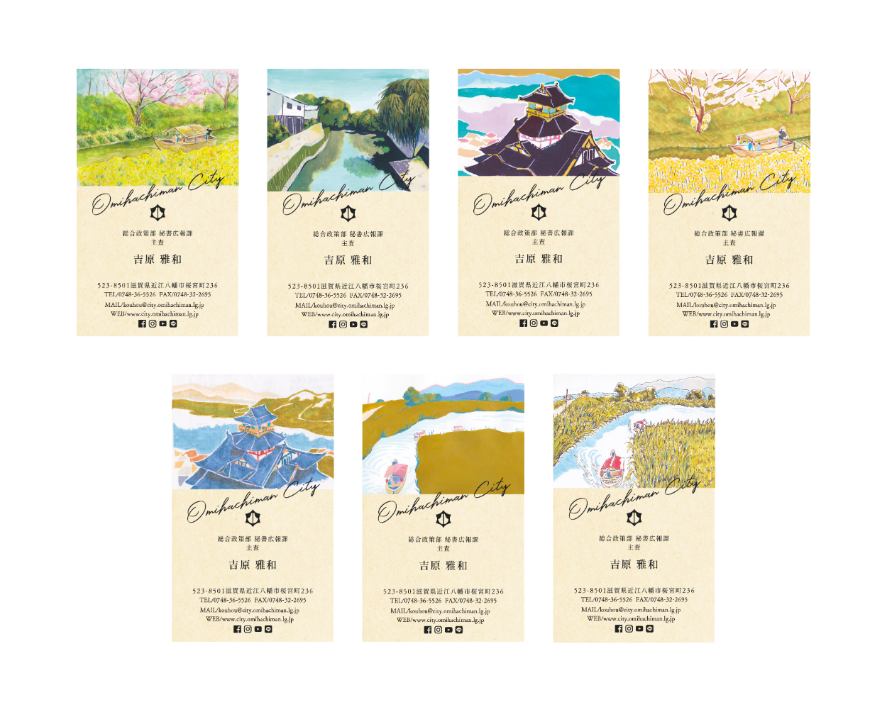 成安造形大学で絵画やデザインを学ぶ池澤虹歩さんが、近江八幡観光物産協会でインターン中に描いた近江八幡の風景イラストを使用。近江八幡の古き良き街並みをイメージしてデザインした。琵琶湖のヨシを原料に使用した名刺用紙に印刷することで、滋賀らしい風合いに仕上げた。