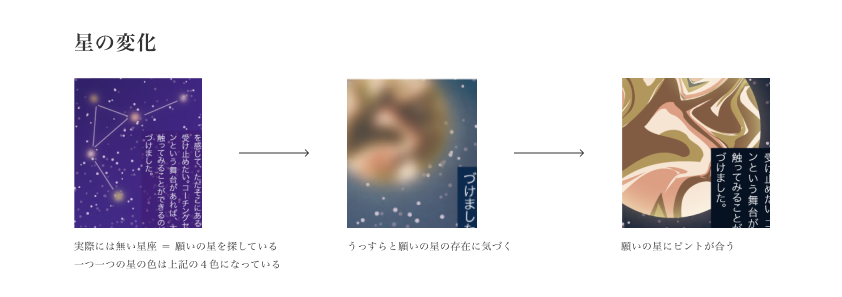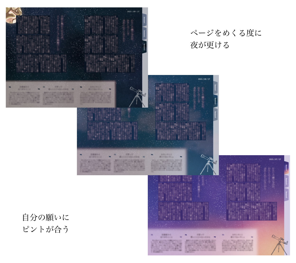 上記2点を踏まえて、ページをめくる度に夜が更け自分の一番星(自分の願い)を見つける物語を一冊にまとめました。