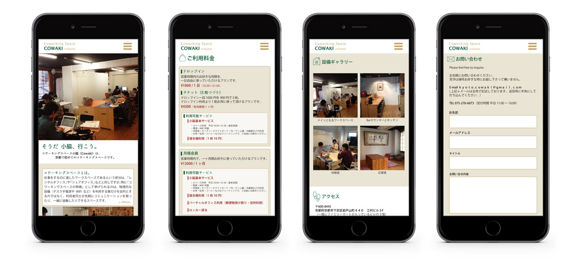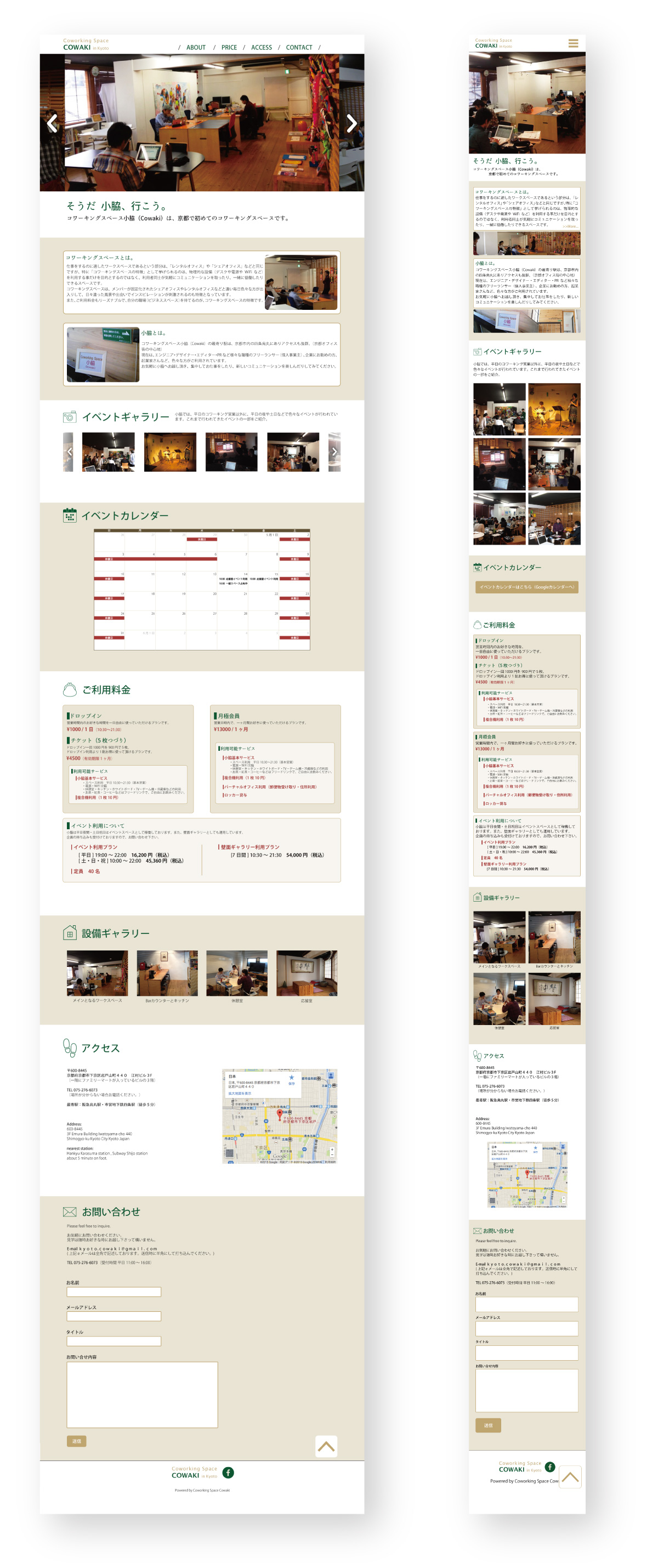 コワーキングスペース小脇 (http://cowaki.com/) というコワーキングスペースの公式サイトのリニューアル案を制作しました。当時のサイトが白い背景に字と写真だけというとてもシンプルなものでしたので、少し装飾をしつつ散らばった情報を見やすく再構成することを目標に制作しました。
