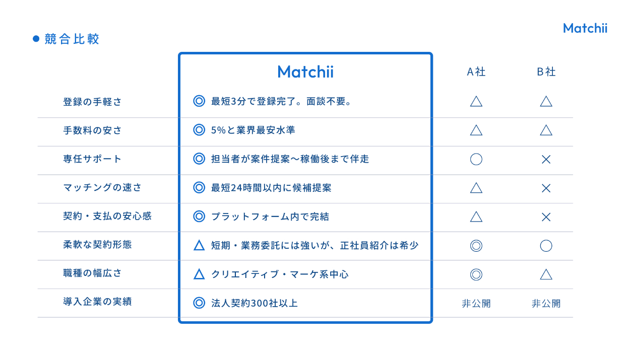 ・Matchiiを選んでもらうために、Matchiiの情報が一番目立つ形で比較できる表にしました。
