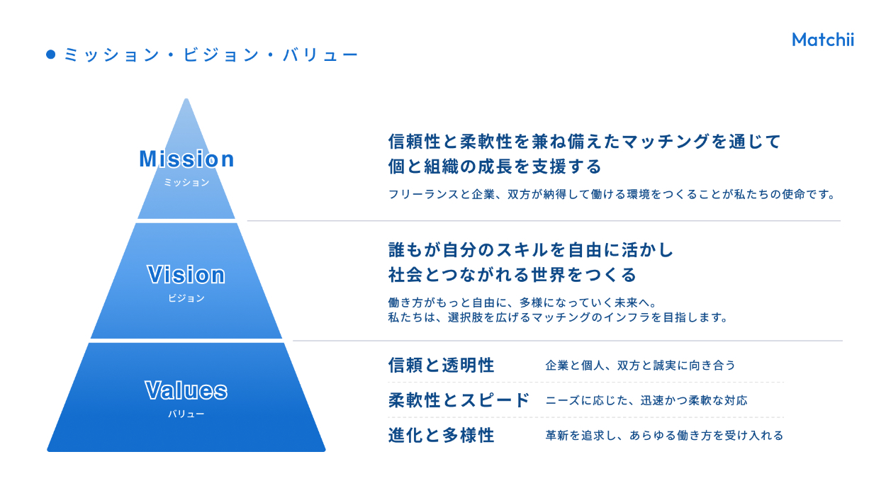 ・関係性がわかるよう、ピラミッドの図でMVVを表現しました。