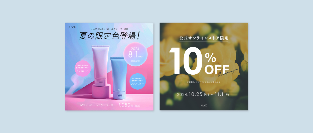夏季限定のコントロールカラーベースの紹介バナーでは、プロダクトカラーに合わせたあしらいを用いて、ベースカラーの色味とメリットを掲載することで、使用イメージを明確にしました。