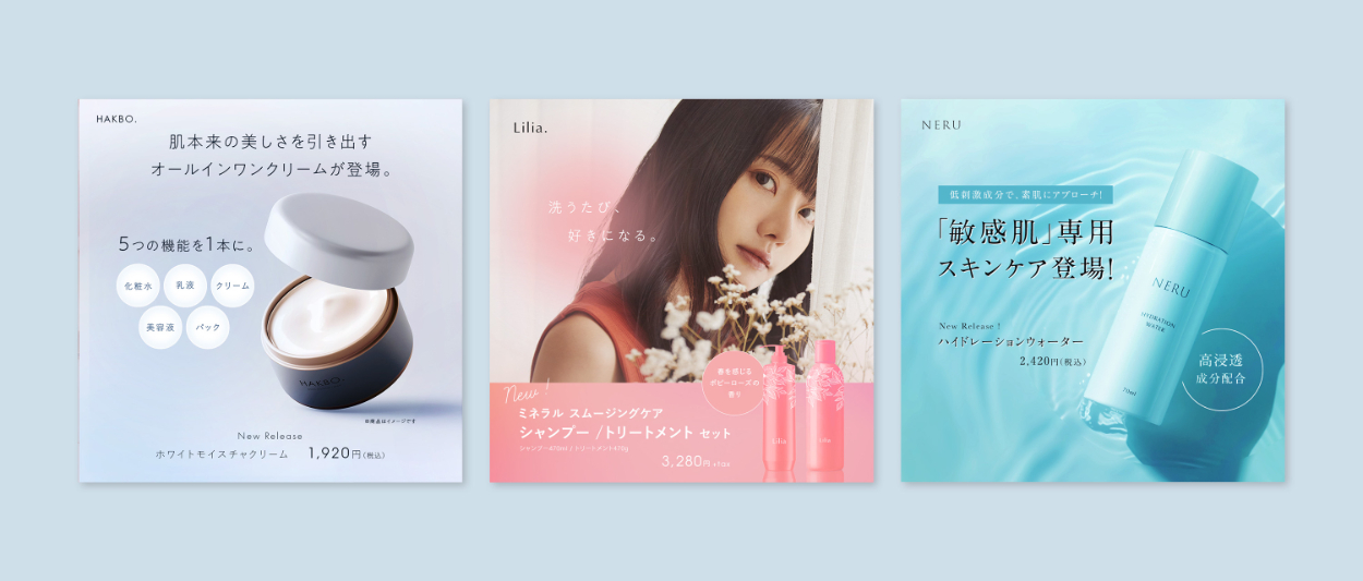 化粧水のリリースバナーでは、高い浸透性を伝える水のテクスチャとカラートーンに調整し、視認性の高いフォントを用いることで、商品の魅力と内容が直感的にわかるデザインに仕上げました。