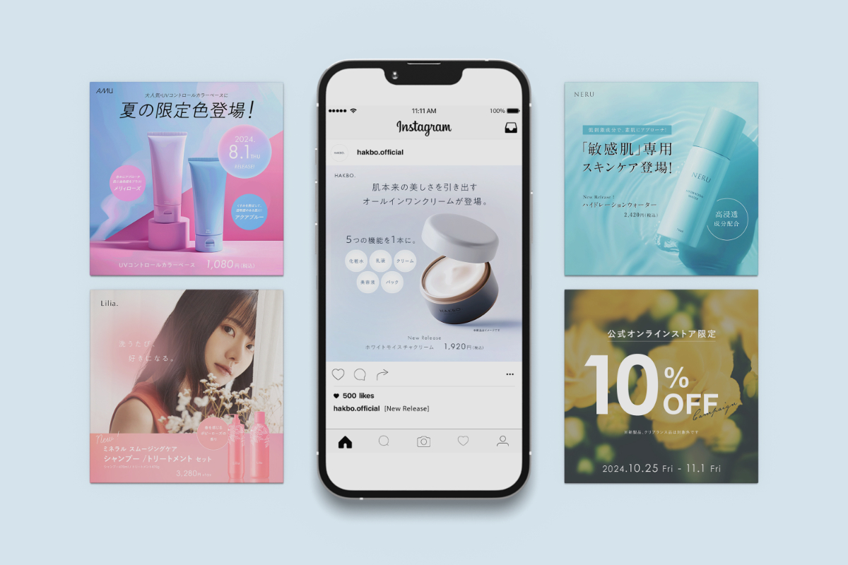 新商品のリリース告知やセール情報の告知まで、多様な場面で使える内容を制作しました。商品の機能性や情緒に訴える魅力を伝えるデザインが課題になりました。