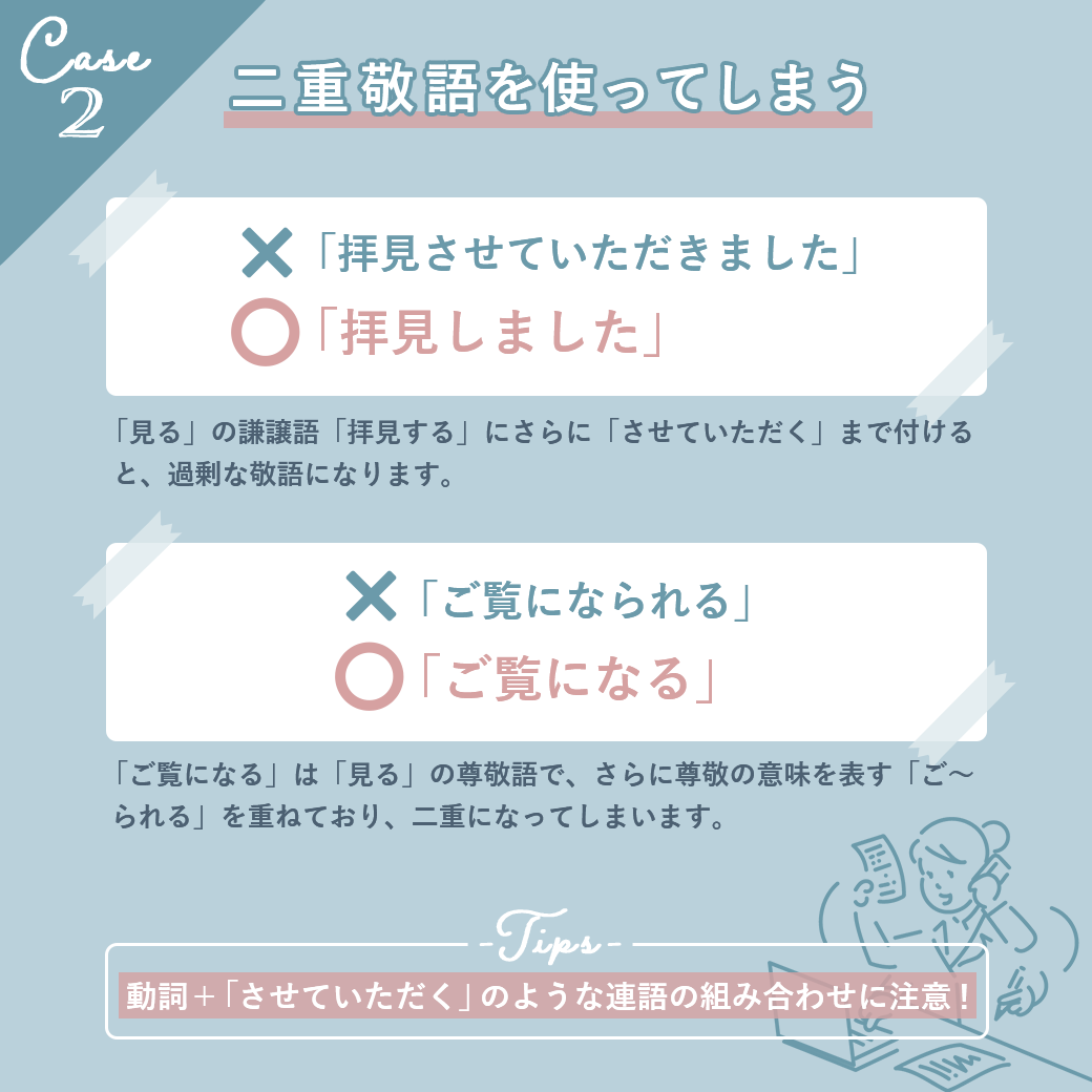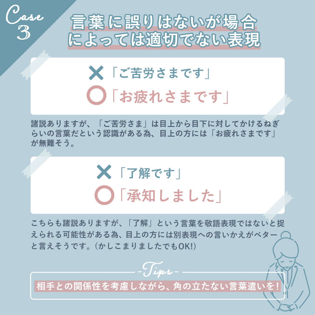 ・ビジネスの場と関連性があるデザインにしたかったので、テープのあしらいをいれて掲示物風のデザインを入れています。正しい例の方は目を引くよう、間違った例より少しフォントを大きくしています。
