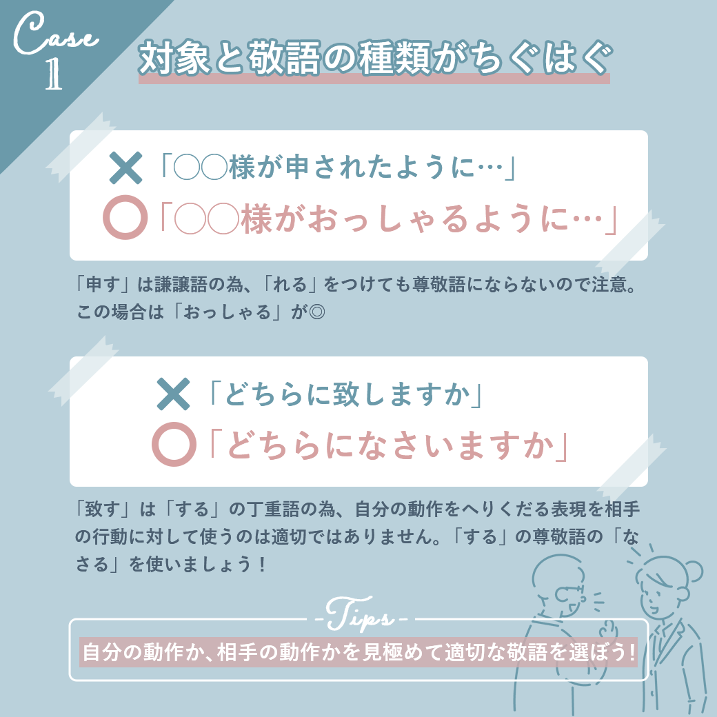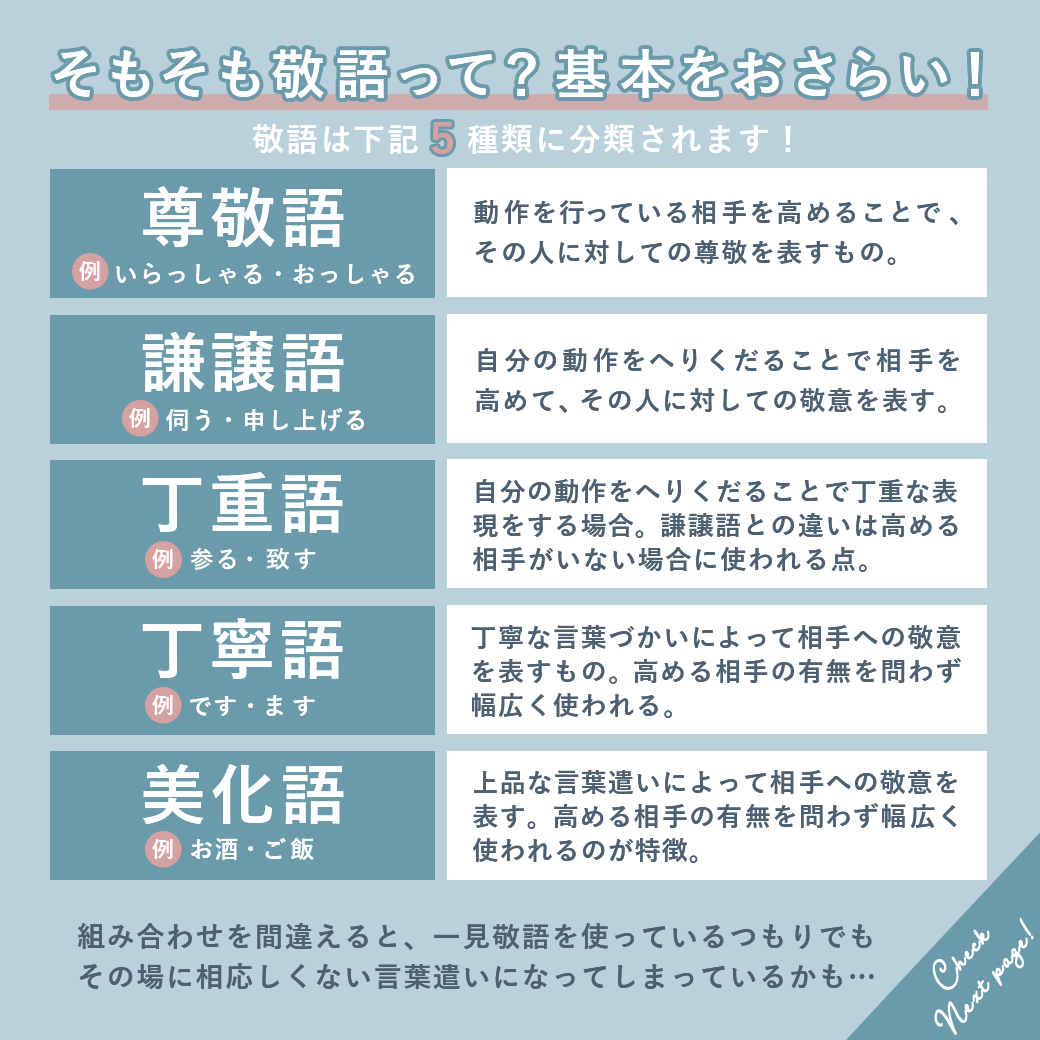 間違いやすい敬語表現がテーマの為、まずは表紙の次の投稿画像は表形式にして敬語の種類をまとめた上で、次のページから間違いやすい例とTipsを紹介するという構成にしました。20~30代の働く女性に読んでもらうことを想定して、ビジネスの際に使われそうな敬語&間違いやすそうなものをピックアップしています。