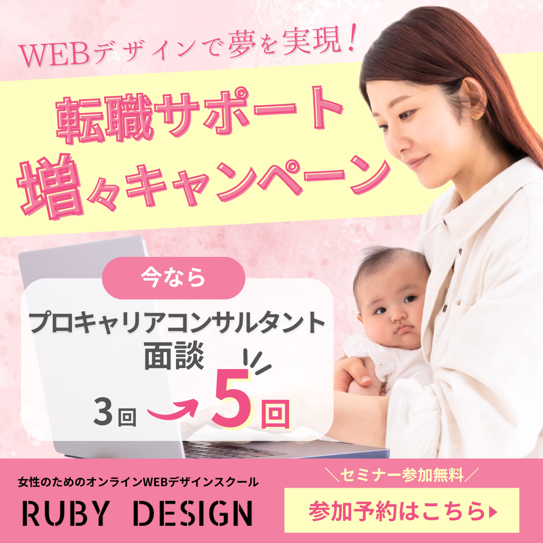 女性向けWEBデザインスクールのキャンペーンを紹介・セミナー参加への誘導というテーマで架空の広告バナーを制作しました。