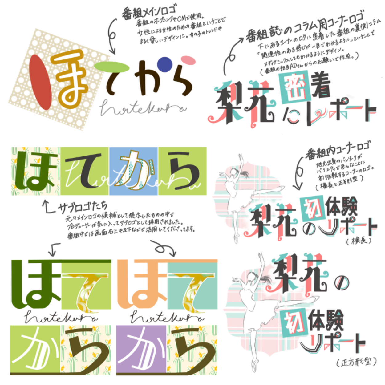 また番組内のコーナーロゴについては、担当のADさんから色指定をいただいたのと、コーナーイメージが若い女の子のトレンドやタレントのバレリーナさんのしたい事との事で、キレイめでかつフレッシュなイメージで仕上げました。