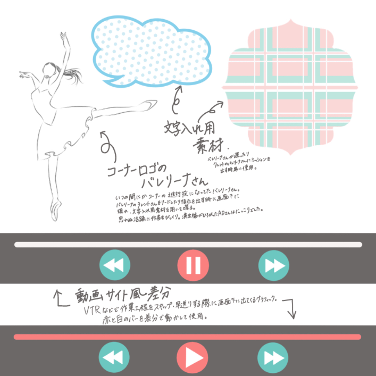 このロゴは担当のADさんもバレリーナさんも気に入ってくださったとの事で、コーナー内に使えそうな素材グラフィックも追加でご用意させていただきました。