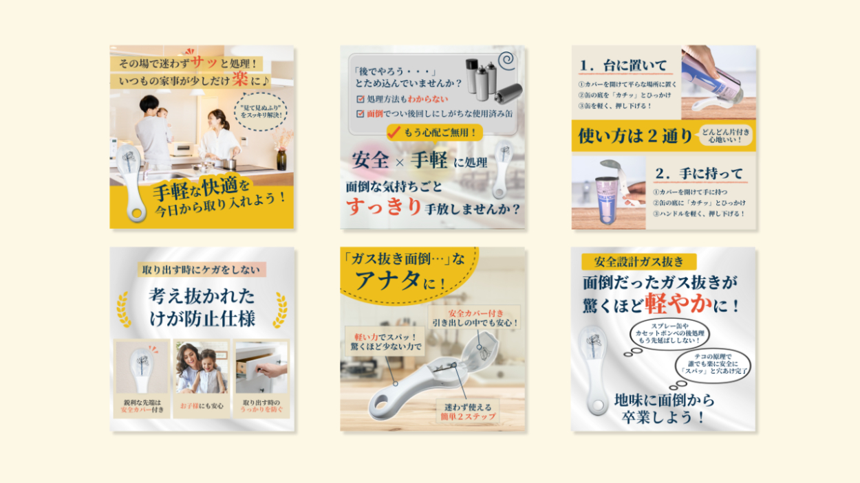 商品の利便性や機能性をしっかり伝え、購入を検討しているお客様の買い物の手助けになるような関心を引くデザインを目指しました。