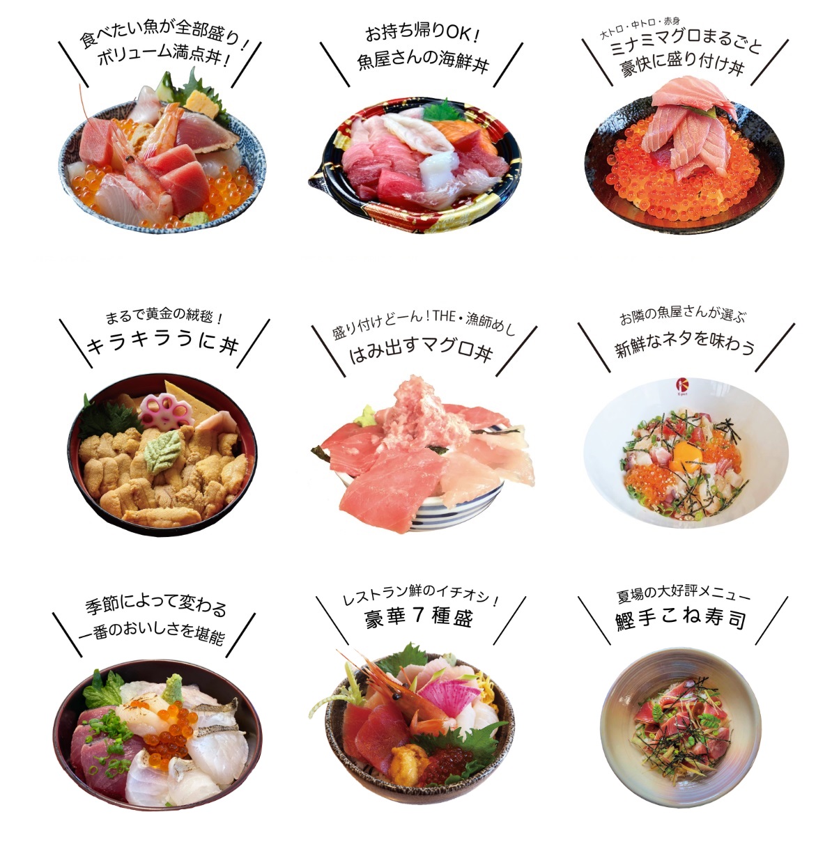 どんな海鮮丼が食べられるか、ぱっと見て比較検討できるよう、各メニューの特徴を一言でまとめ、画像付きの一覧とした。