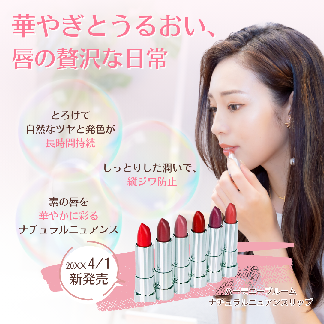 また、キャッチコピーの「華やぎ」「潤い」「贅沢」というワードには、「リップクリーム」という日常的に使用する化粧品の中でも最も手軽に印象を変えられるアイテムを、ワンランク上のものにするだけでより素敵な自分になれる、と思わせるため、フォントや透明感を用いてそれを視覚的にも伝えている。さらに購買意欲に繋がる点として、発色の良さに続いてユーザーの悩みで多く上がる、持続力と保湿度合を売りにしているため文字色を変えて目立つようにしている。