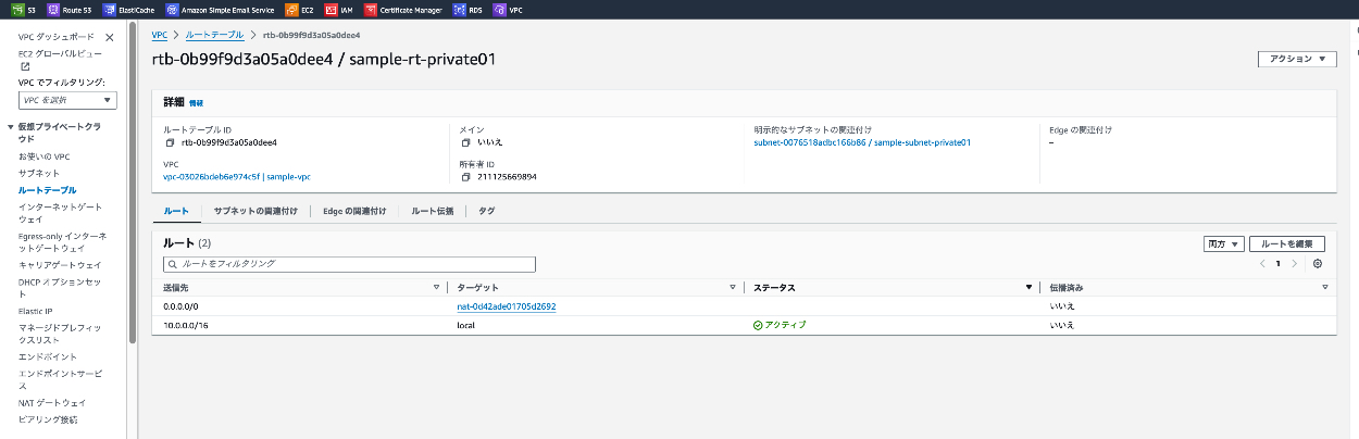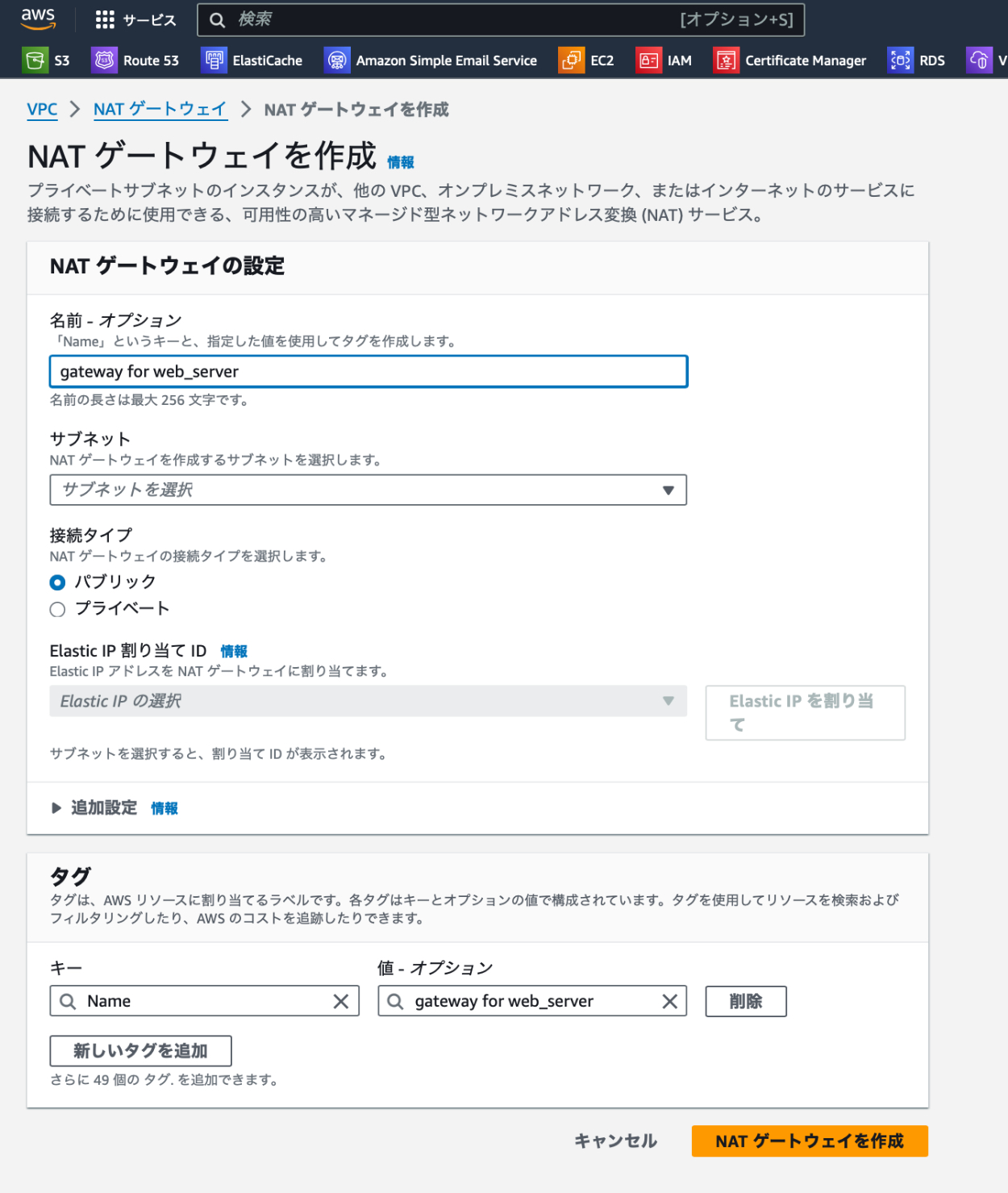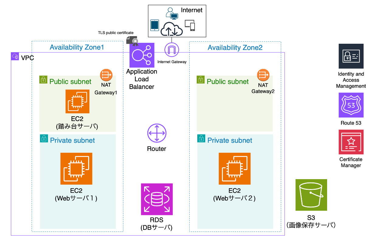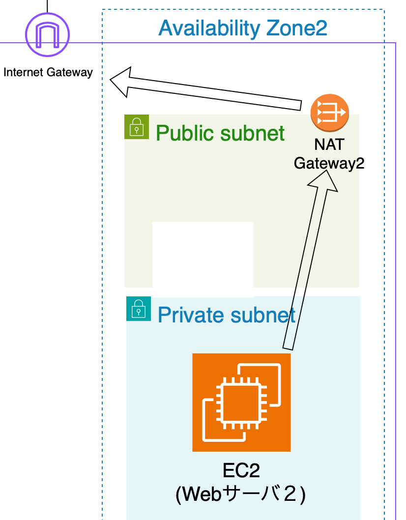 NetworkAccessTransration(NAT)とは、IPアドレスとポートをNAT前後で変換させるものです。本システムにおいては、セキュリティの観点からWebサーバはプライベートサブネットに設置しておりますが、実行環境構築といった場面においては、インターネットへの接続が便利です。このためWebサーバのインターネット利用を可能とするため、WebサーバのデフォルトゲートウェイとしてNATGatewayを指定し、プライベートサブネットに存在するWebサーバのインターネットへのアウトバウンド接続を可能とさせます。