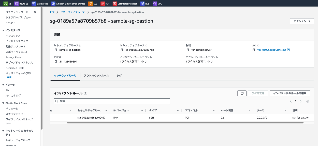 Webサーバは外部からのアクセスができないようプライベートサブネットに設置し、外部からのアクセスは別途の踏み台サーバからアクセスします。そのため、踏み台サーバからのアクセスのみを受け付けるようにセキュリティグループを設定します。