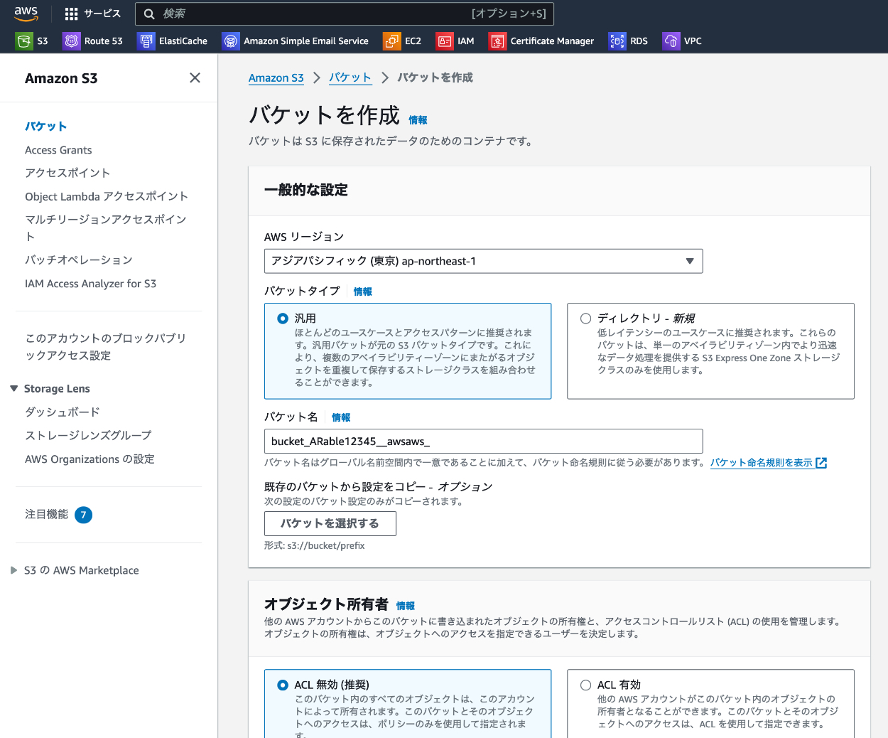 S3バケットはAWSのVPC内部ではなく、外部インターネットに配置されるため、バケット名は他とは重複しないユニークな名前を付ける必要があります。