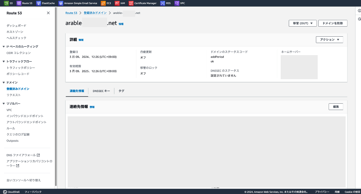 電子証明書の取得にあたりドメイン認証が必要なため、まずはAWSサービスの一つであるRoute53を用いてドメインを取得します。