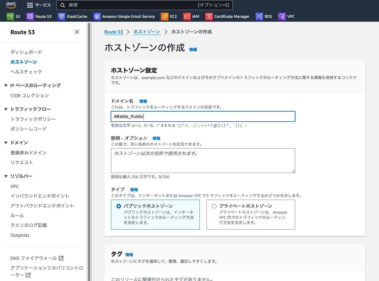 パブリックドメインを取得したので、フロントエンドからの通信時における名前解決を行うホストゾーン(パブリックDNSサーバ)を設置します。ここではロードバランサに割り当てられたElasticIPアドレスに対してドメイン名の対応付けを行います。