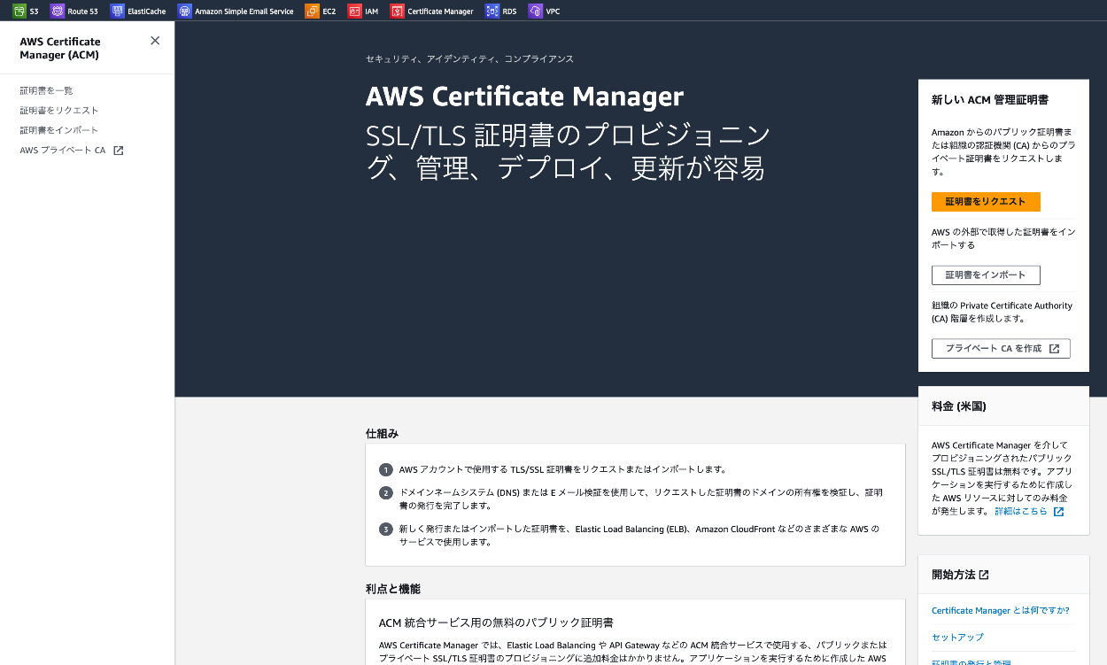 ドメイン取得後、同じくAWSサービスであるAWS Certificate Managerを用いて電子証明書発行を行います。この時のドメイン認証に掛かるドメインが、同じくAWSサービスのRoute53経由で取得したものなら比較的スムーズに電子証明書を取得することが可能です。