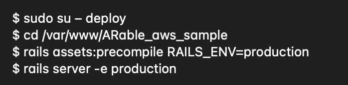 productionモードでRailsサーバを起動するために、var/www/ARable_aws_sample において、以下のコマンドを実行します。