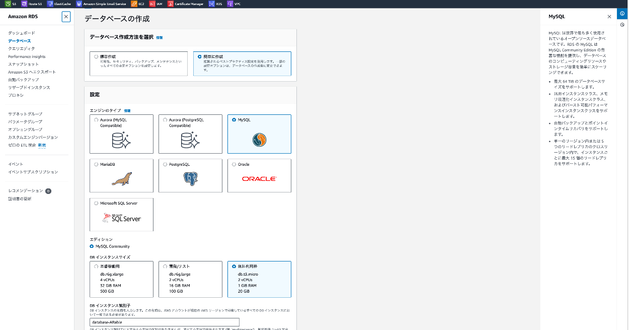 データベースはAWSのマーネジドサービスであるRDS(Relational Database Service)を用いて作成します。データベースエンジンとしてはMySQLを指定し、エンジンの性能に相当するインスタンスタイプには db.t2.microを設定します。
