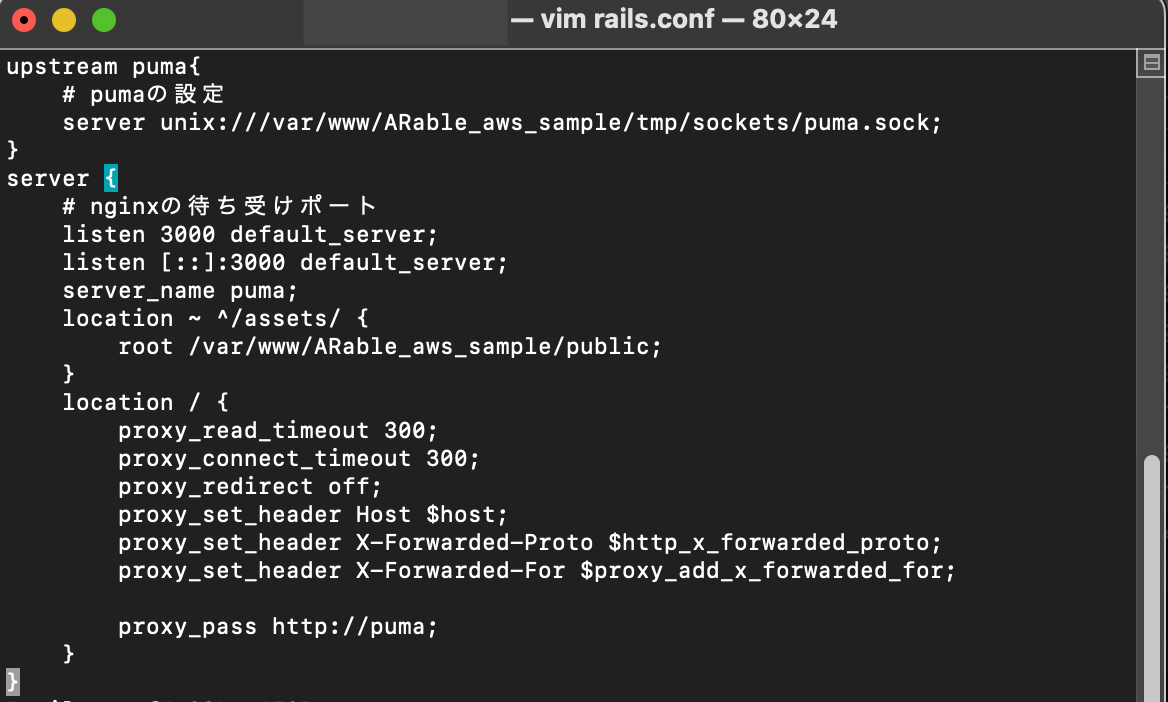 Webサーバとして作成したEC2インスタンスを、Webサーバとして動作させるため、Nginxをインストールします。またNginx設定ファイル(/etc/nginx/conf.d/rails.conf)を以下の通りに記載します。