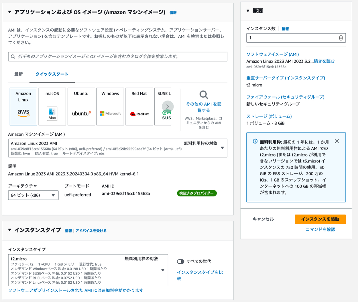 WebサーバはEC2(Elastic Compute Cloud)インスタンスを用いて作成します。マシンイメージとしてはAmazon Linux 2023 AMIを設定し、マシンの性能に相当するインスタンスタイプにはt2.microを設定します。