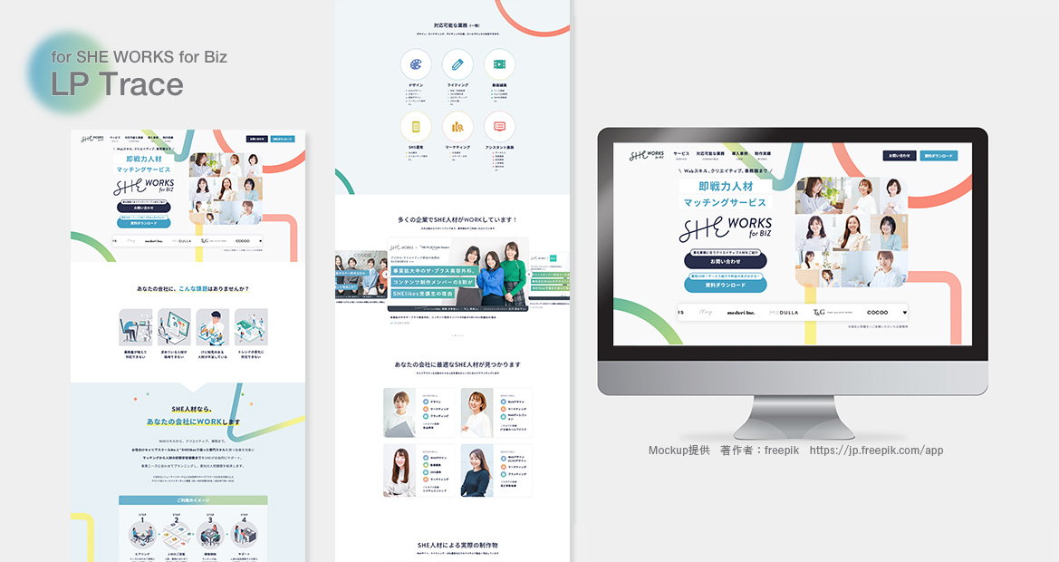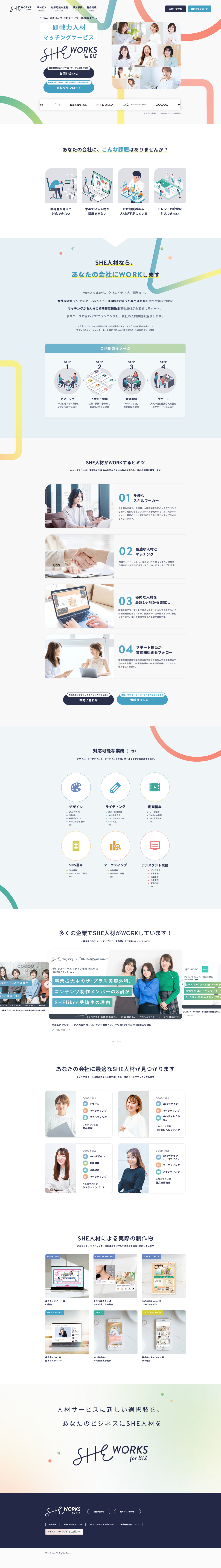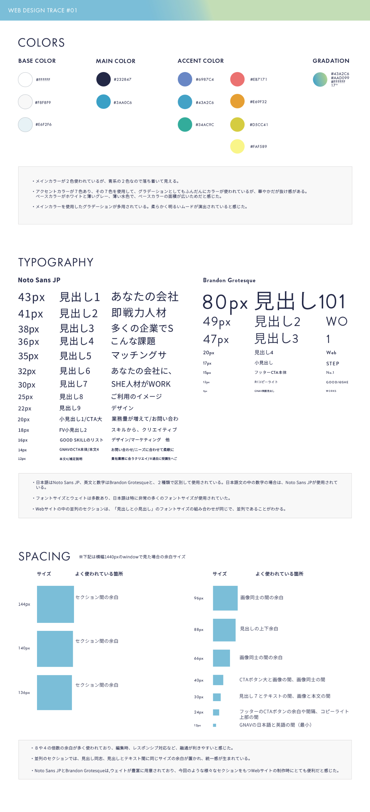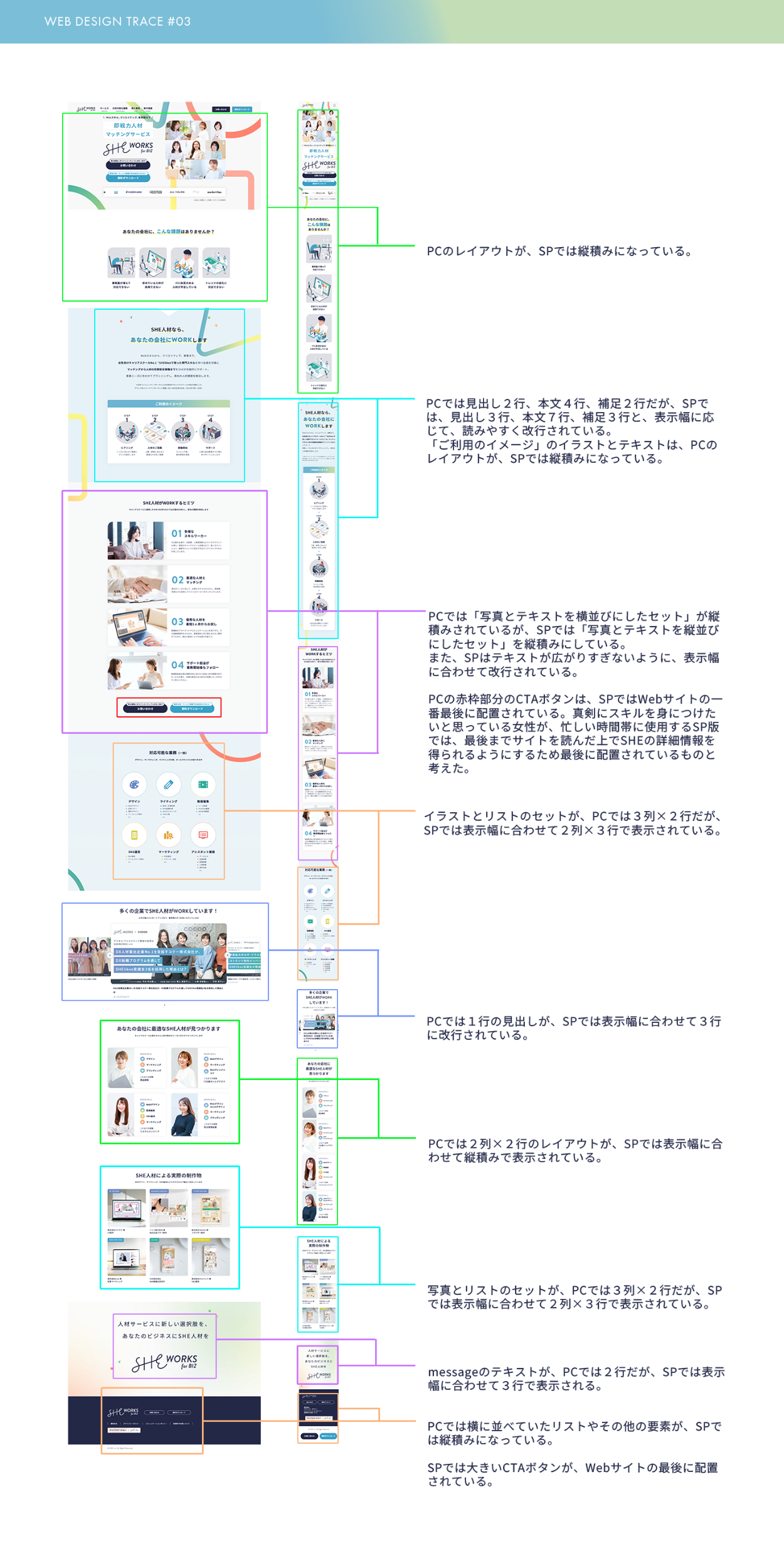 SHElikes PRO DESIGNER COURSの3つ目の課題です。SHE WORKS for Biz様の「LPトレース」「スタイルシート(カラー・フォント・スペースの分析)」「PC版とSP版の比較分析」の3点を制作しました。
