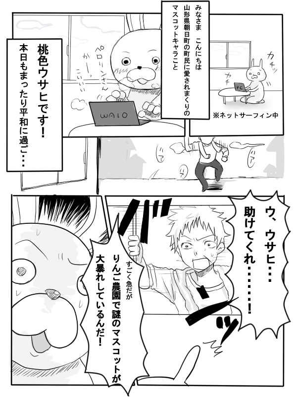 山形県朝日町の既存ゆるキャラ「桃色ウサヒ」のPR企画を考えるという地域貢献に関わるゼミ課題から始まった卒業制作です。2011年12月〜2012年4月までほぼ毎週水曜日に約5〜10Pを配信しておりました。正直、かなり絵としては下手ですが…山形県内のメディアへも取り上げられました。