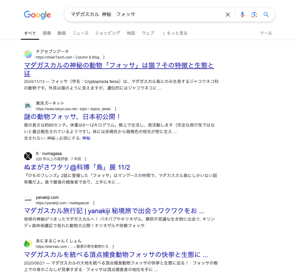 「マダガスカル 神秘 フォッサ」というキーワードのライティング記事が、私が作成した記事が、検索結果の第1位にランクイン