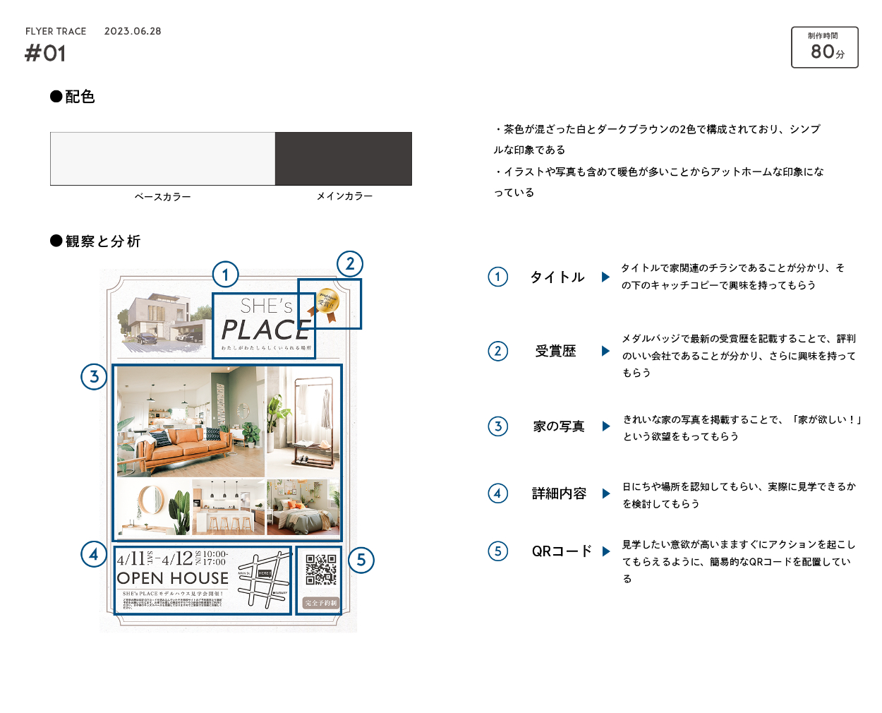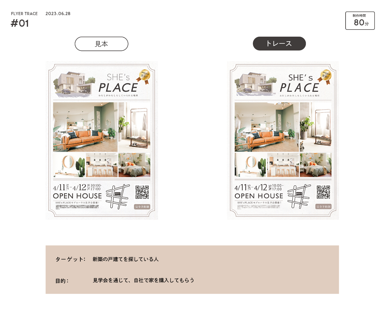 SHE likesの制作課題として、フライヤートレースに取り組みました。 「ターゲット」「目的」「配色」「視線誘導」の分析結果もまとめています。 [制作時間:80分/まとめ30分/使用ツール:Illustrator/Photoshop]