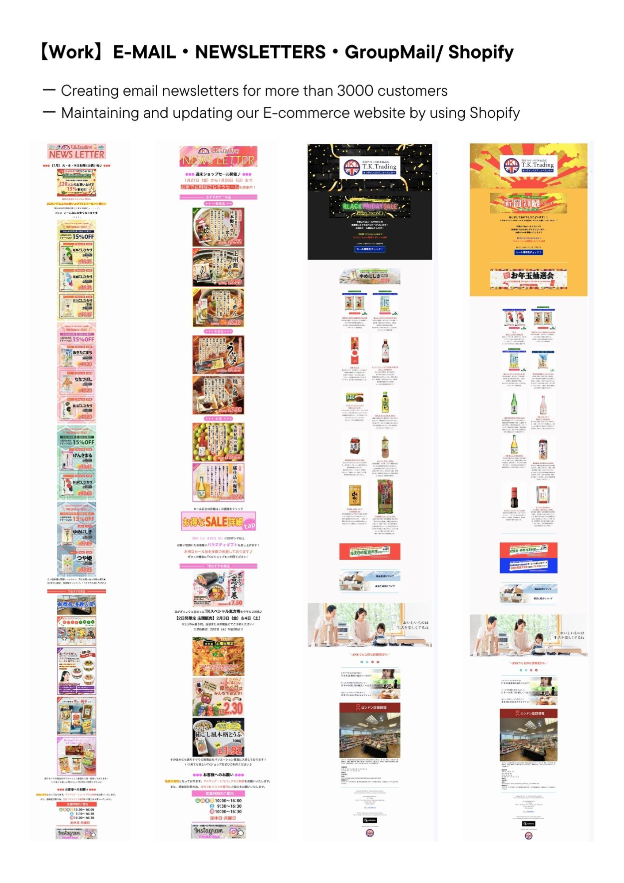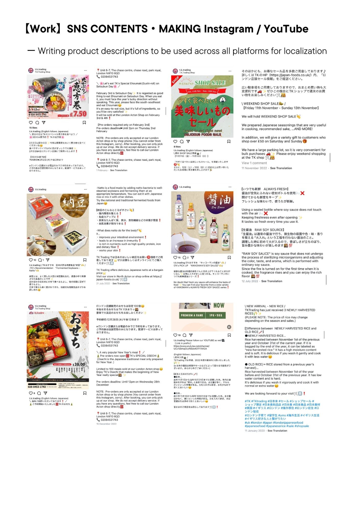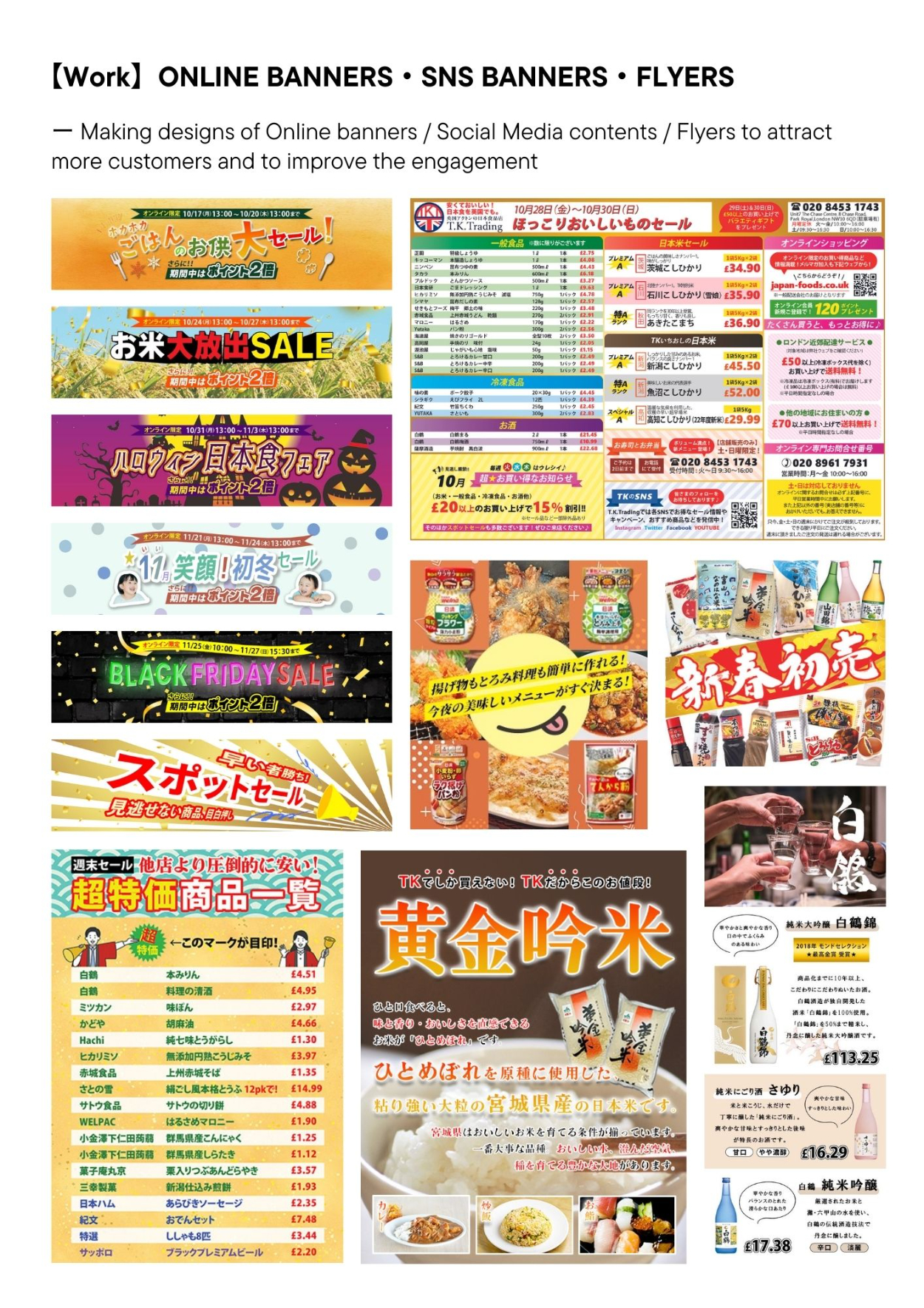 【実案件】ロンドンの日系食料品店 デザイン各種 Naomi Yamada Web制作 / SNS運用 / ブランディング OVERVIEW オンラインサイト・Instagram広告バナー・チラシ作成、週刊ニュースレター作成、SNS (Instagram / YouTube) 投稿内容の企画・撮影・編集・ローカライゼーション翻訳を行いました。 YEAR 2023