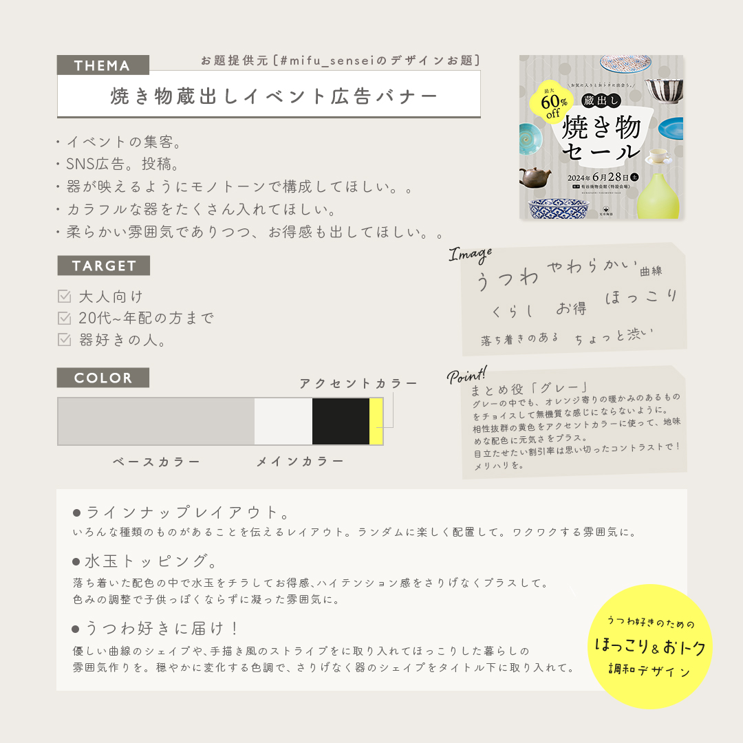 【自主制作】焼き物イベントバナー KEIKO UEDA デザイナー/イラストレーター OVERVIEW 2024.6.27/制作時間:4時間/制作ツール:Illustrater/コンセプト:焼き物好きに刺さるほっこりとた温もりと、お得な印象の調和のあるデザイン。 YEAR 2024