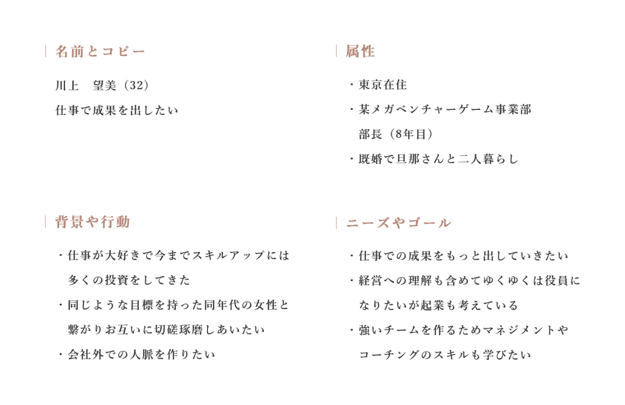 女性向けのビジネススクール「WORK」を展開している会社。会員は20~30代の女性が多く、キャリアアップのためにビジネススキルを学び、さらにそのアウトプットの場として定期的にビジネスコンテストなどのイベントも開催されている。