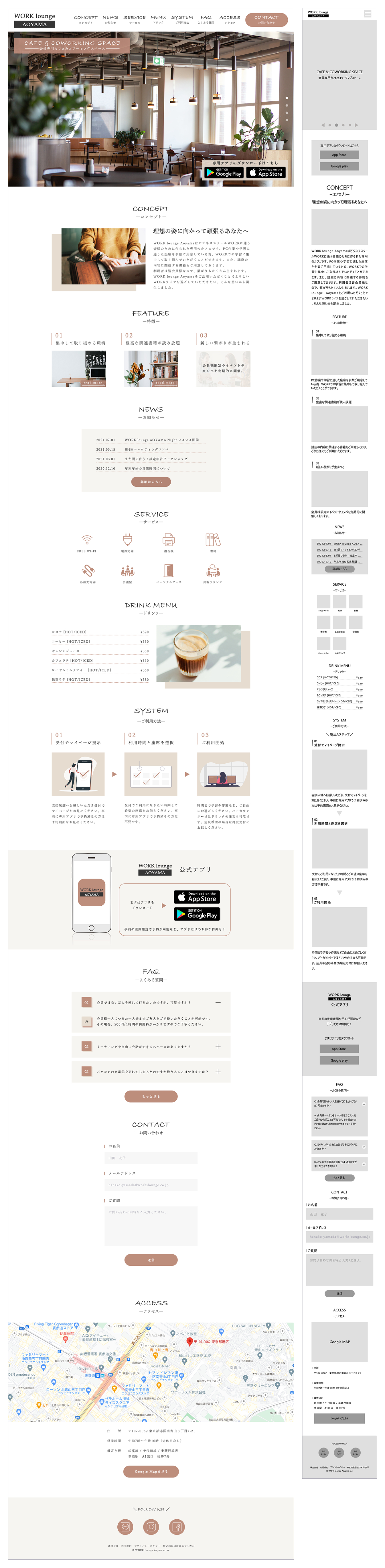 クライアントからのワイヤーフレームでは、飲み物の写真がそれぞれ配置されていました。ラウンジの売りポイントになるような突出したメニューがないと考えた為、写真を1枚に変更してコンパクトにまとめました。ただし、作業中にほっと一息つくときに飲みたくなるメニューではあるので、暖かい日差しの中でリラックスしている姿を想像できるような写真を選択。