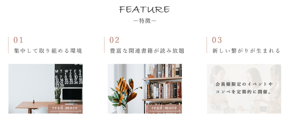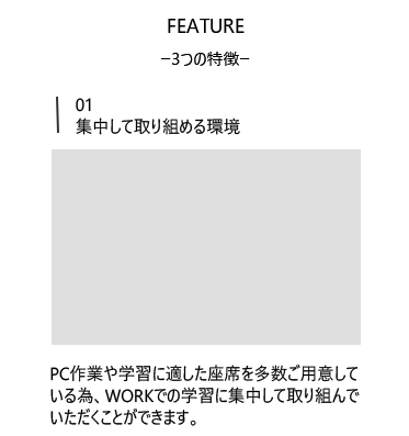 クライアントからのワイヤーフレームになく追加したコンテンツ(以下「追加コンテンツ」)。コンセプトの本文文字数が多く、読み飛ばされてしまう可能性もあることから、3つのポイントを抜き出して紹介。写真をホバーするとさらに詳しい説明が表示される想定。清潔感を感じるようなトーンが高い明るい写真を選択。