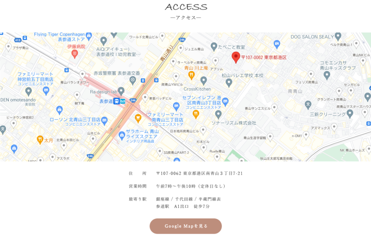 位置情報が分かりやすいように、またLP全体のバランスとメリハリのため地図を画面横幅いっぱいに大きく配置。最寄り駅情報を追加してより分かりやすくしました。