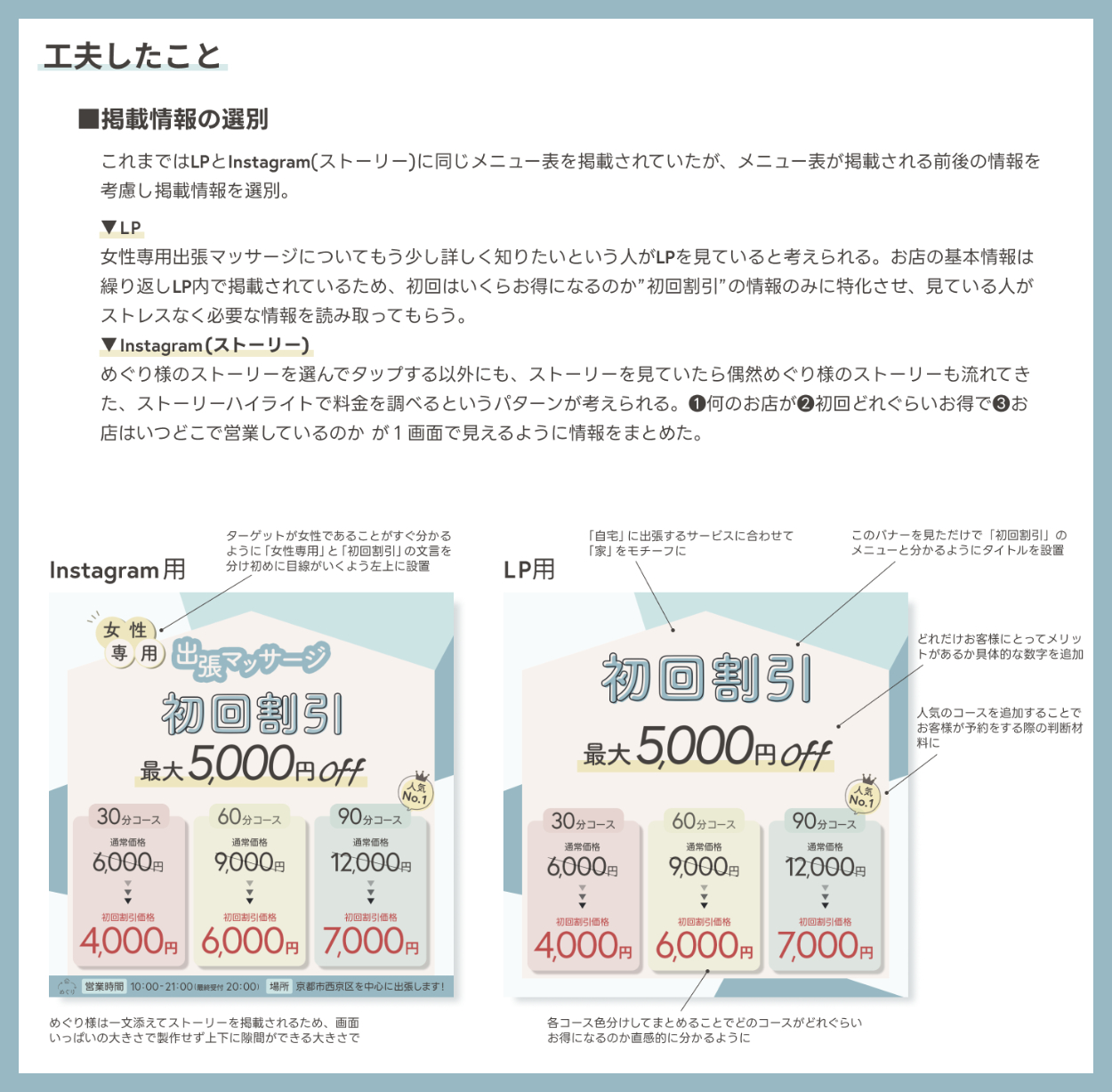 - LPとInstagram(ストーリー)で使用していた「初回割引」メニュー表の情報を整理し、より見やすくお得感が伝わるものに改善する。