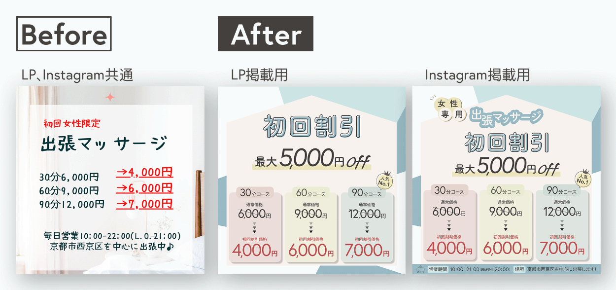 女性専用出張マッサージ「めぐり」様より、LPとInstagram(ストーリー)で使用されていた「初回割引」料金表の改善をご依頼いただきました。
