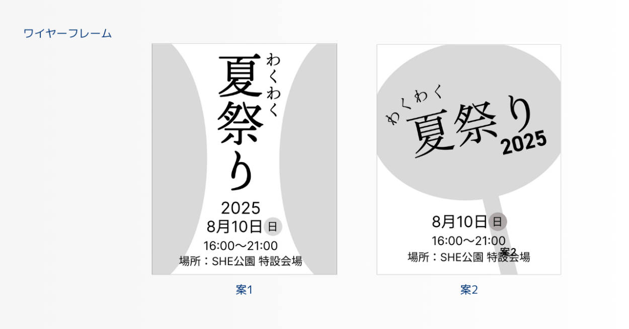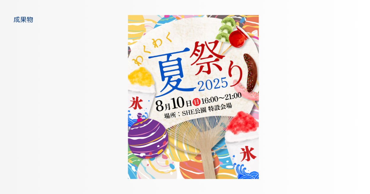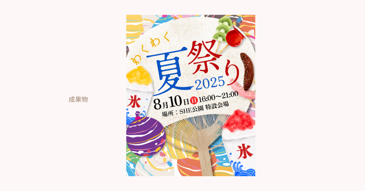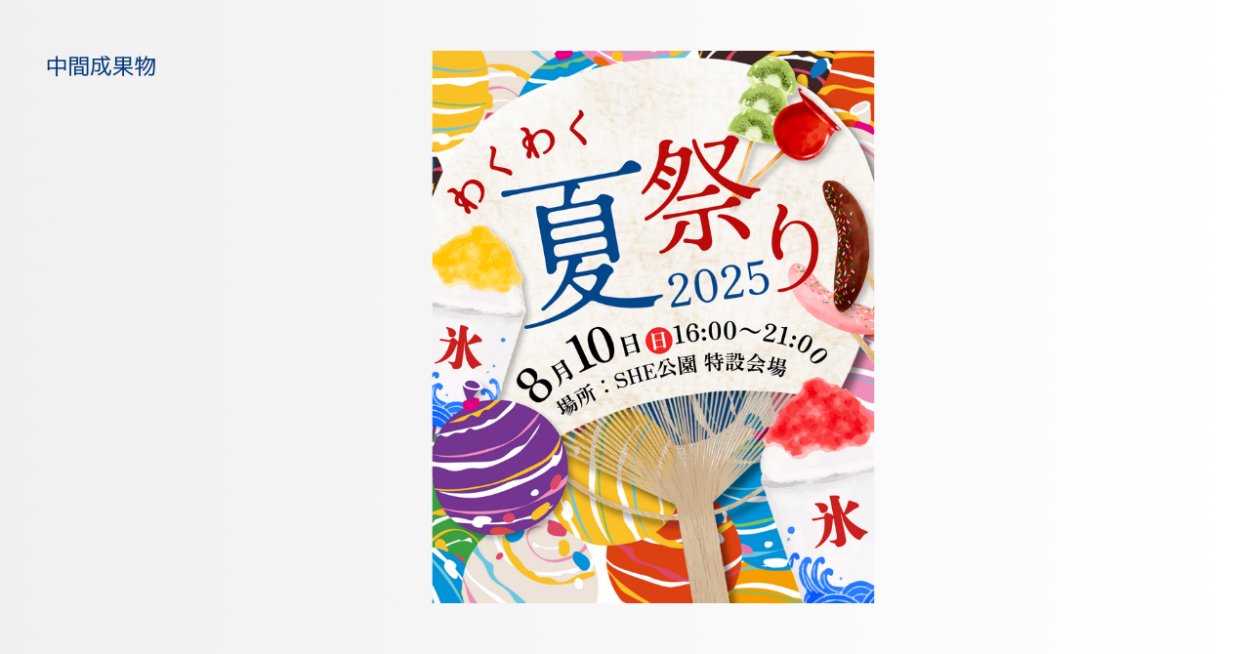 - 日時の一番右の0のカーニングをもう少し狭くするか、うちわの縁に沿うのではなく、日時と場所を真っすぐにして「夏祭り2025」に合わせてみるのも良いのではないか。