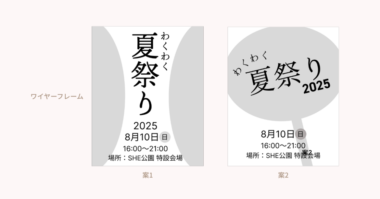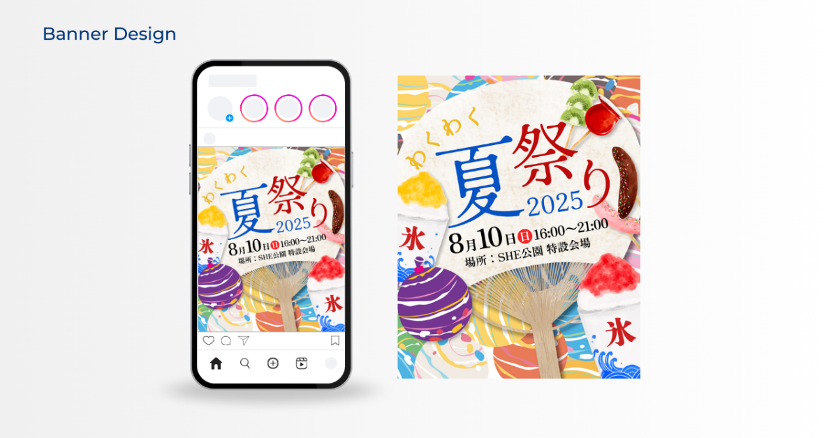 - 案1は縦書きで和風のテイスト、案2はうちわを前面に配置して要素を入れたもの。案1は他の夏祭りとの差別化ができないと考えた。Instagram広告に掲載するので印象に残りやすいのではないかと思い、案2で決定した。