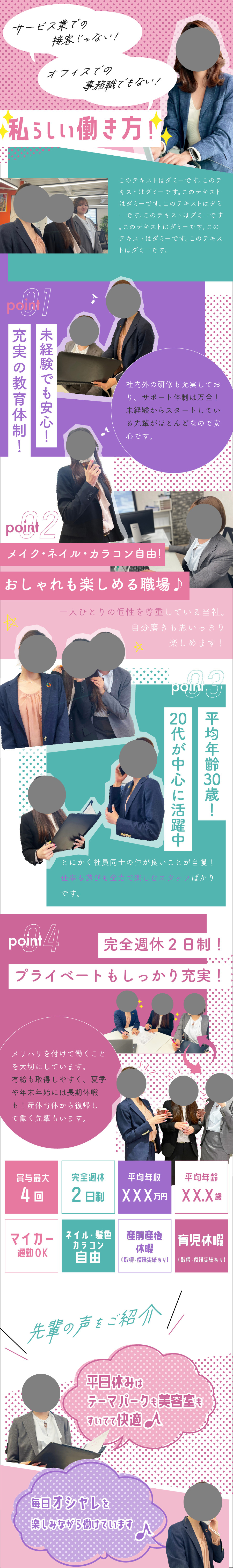 【実案件】A社 LP型求人広告+バナー mai gougi Webデザイナー OVERVIEW マイナビ様に掲載する求人広告のクリエイティブを制作しました。 YEAR 2024 制作期間:10時間制作目的:どんな会社かをアピールし、求人へ応募をしてもらう(CTAは担当外)担当範囲:写真選定、デザイン与件:文言、写真ターゲット:おしゃれを楽しみながらオフィスで働きたいと思っている20代女性制作物①(メッセージ画面)制作物2(バナー)