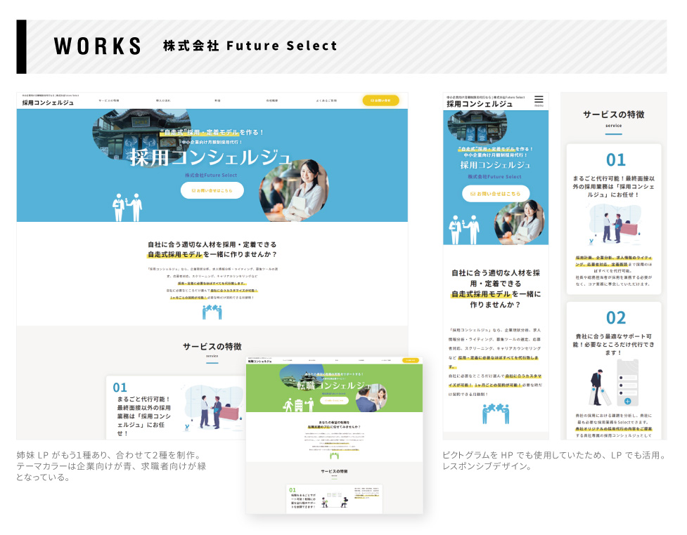 企業のターゲットは人材を求める企業と求職者。2種のターゲットを持ち合わせるため、2種のLPを制作。新規事業のLPで出来るだけ低予算でとのことだったので、今まで制作したLPをベースにカスタマイズを行った。