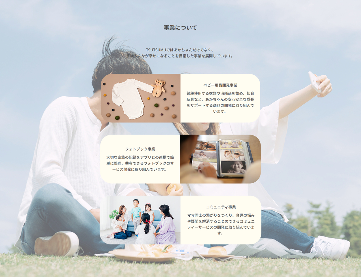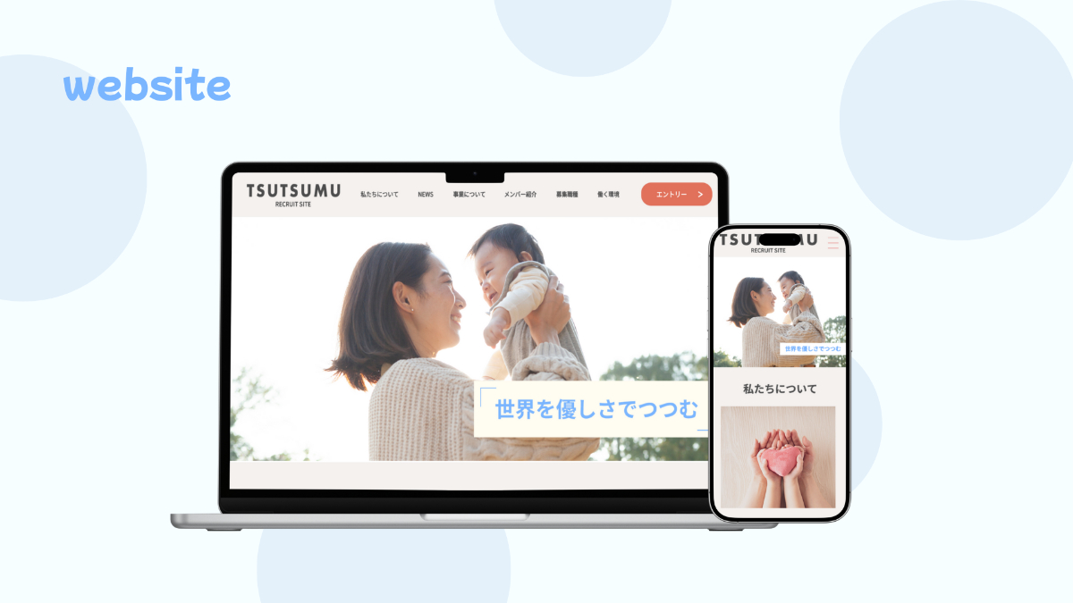 ・メインビジュアルにお母さんが赤ちゃんを抱っこしている写真を使用することで、会社名にもなっているコンセプトである「包む」を表現
