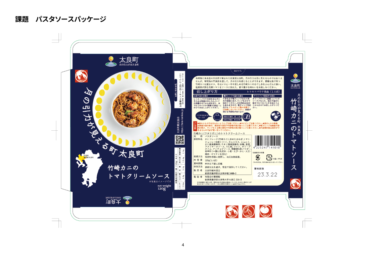 観光協会からの依頼を想定し、特産物である竹崎カニを使ったパスタソースのパッケージで、実際のパスタソースに記載のある要素をもとにオリジナルのものを作成しています。