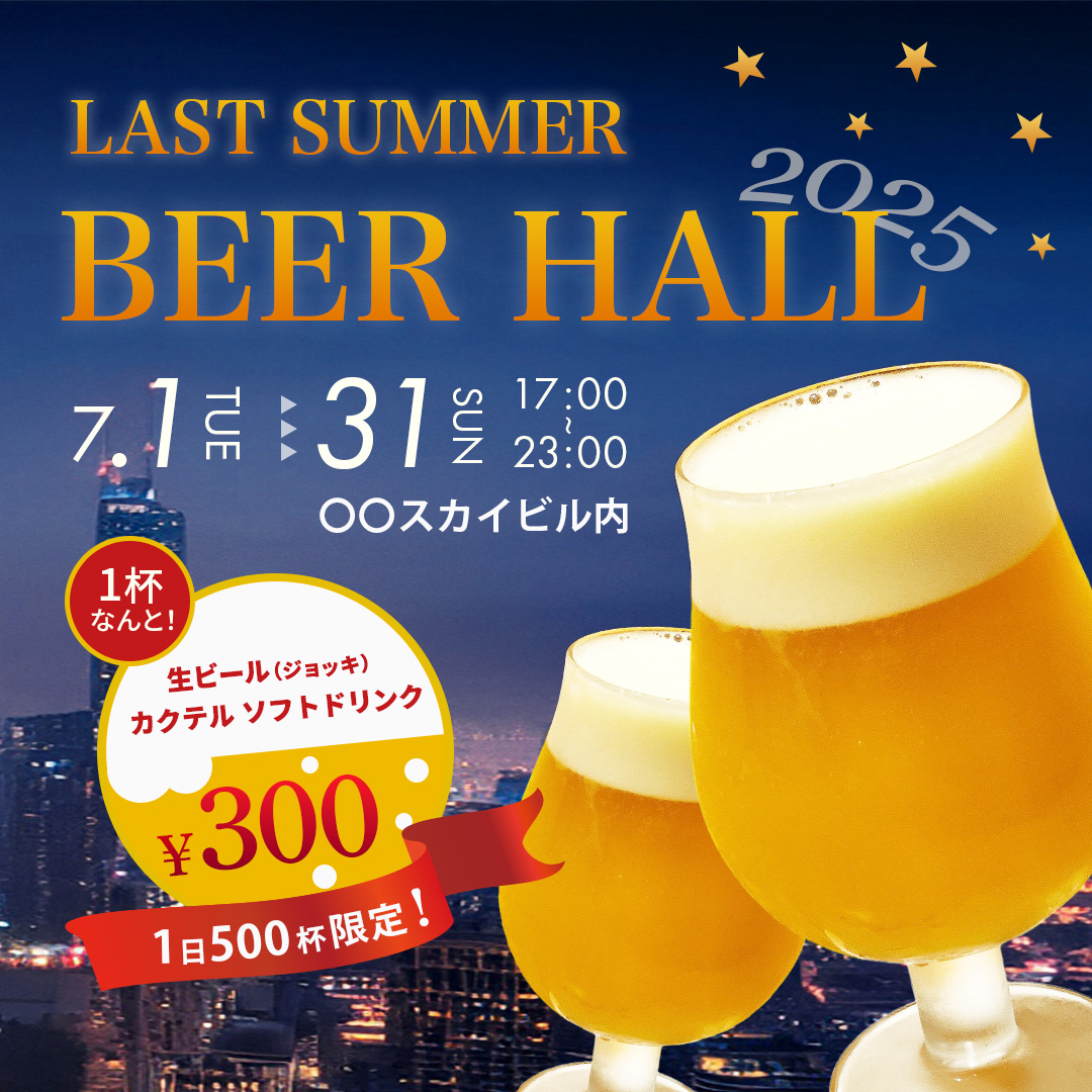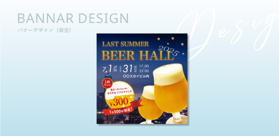 夏に都心のオフィス街のビルの屋上で開催されるビアガーデンフェスのイベントバナーを作成。たつの夜を彩るワクワク感を感じられるデザインに。