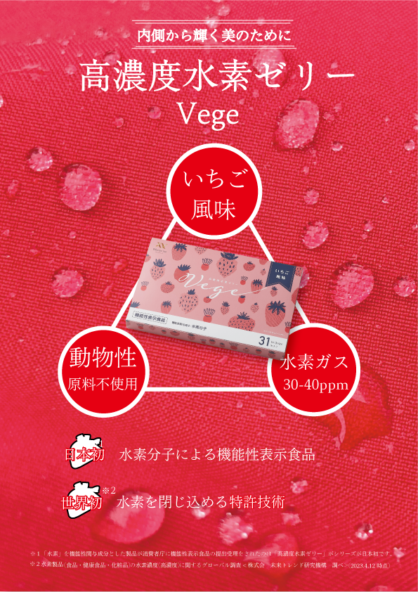 高濃度水素ゼリーvege A4チラシコンペ作品 ズアンカ・たかジロ webデザイナー OVERVIEW Illustrator使用 フリー素材引用 このチラシはB型作業所開所前のコンペ作品のチラシです。いちご味のイメージと高級感とみずみずしさを表現しました。