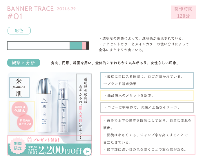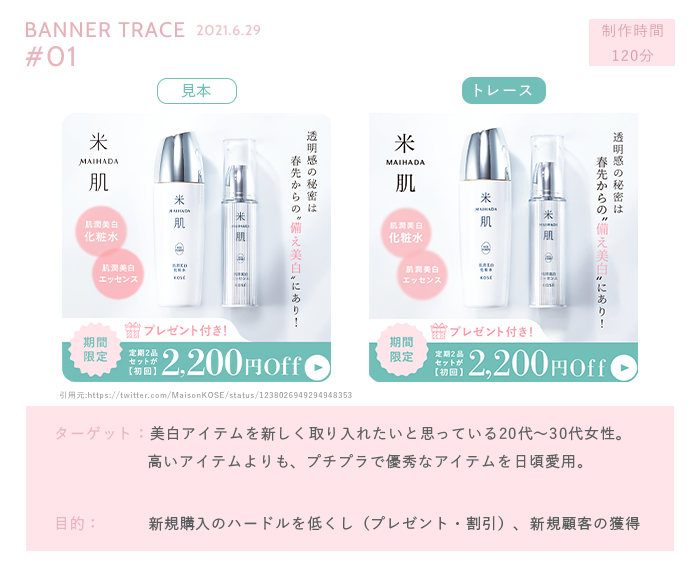 SHElikes MULTI CREATOR COURSE Designerの課題で、「KOSEエイジングケアブランド 米肌」バナートレースに取組みました。バナーの目的・ターゲット・配色・観察と分析の結果をまとめました。(制作時間:トレース120分 / まとめ90分)
