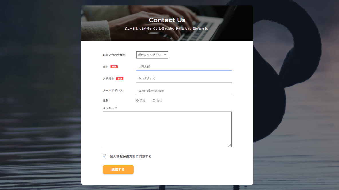 フォームの送信ボタンは、必須項目の入力とチェックボックスのチェックが入るとdisabledが外れる仕様にしました。