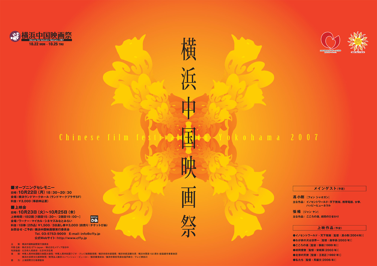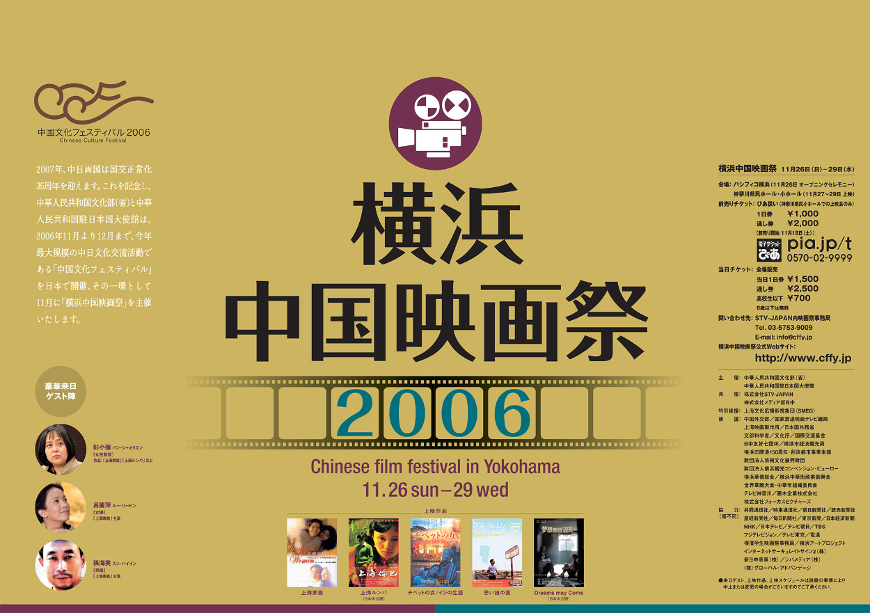 交通広告 H. Hiroyasu Art Director | Designer OVERVIEW 横浜中国映画祭[株式会社メディア新日中様] YEAR 2006 - 2007 2006-2007年、横浜で開催された横浜中国映画祭のアイテムを制作させていただきました。(中吊り広告・ポスター・プログラム・チケットほか)□アートディレクション □デザイン □DTP