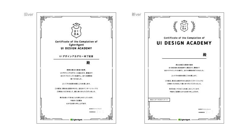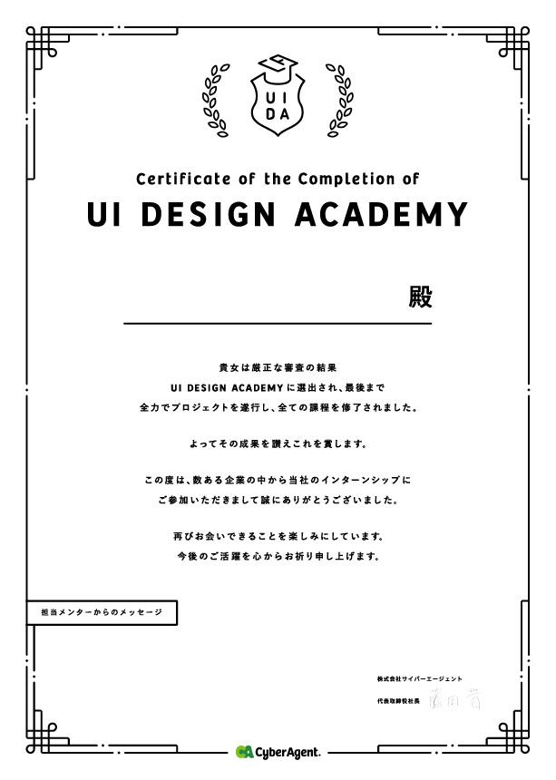 UIDAインターン 賞状のリデザイン ishii_ayaka UI/UX デザイナー 賞状既存の賞状のデザインを元に、メンターからのコメントを記入できるようにリデザインを行なった。▽実際に使用された様子